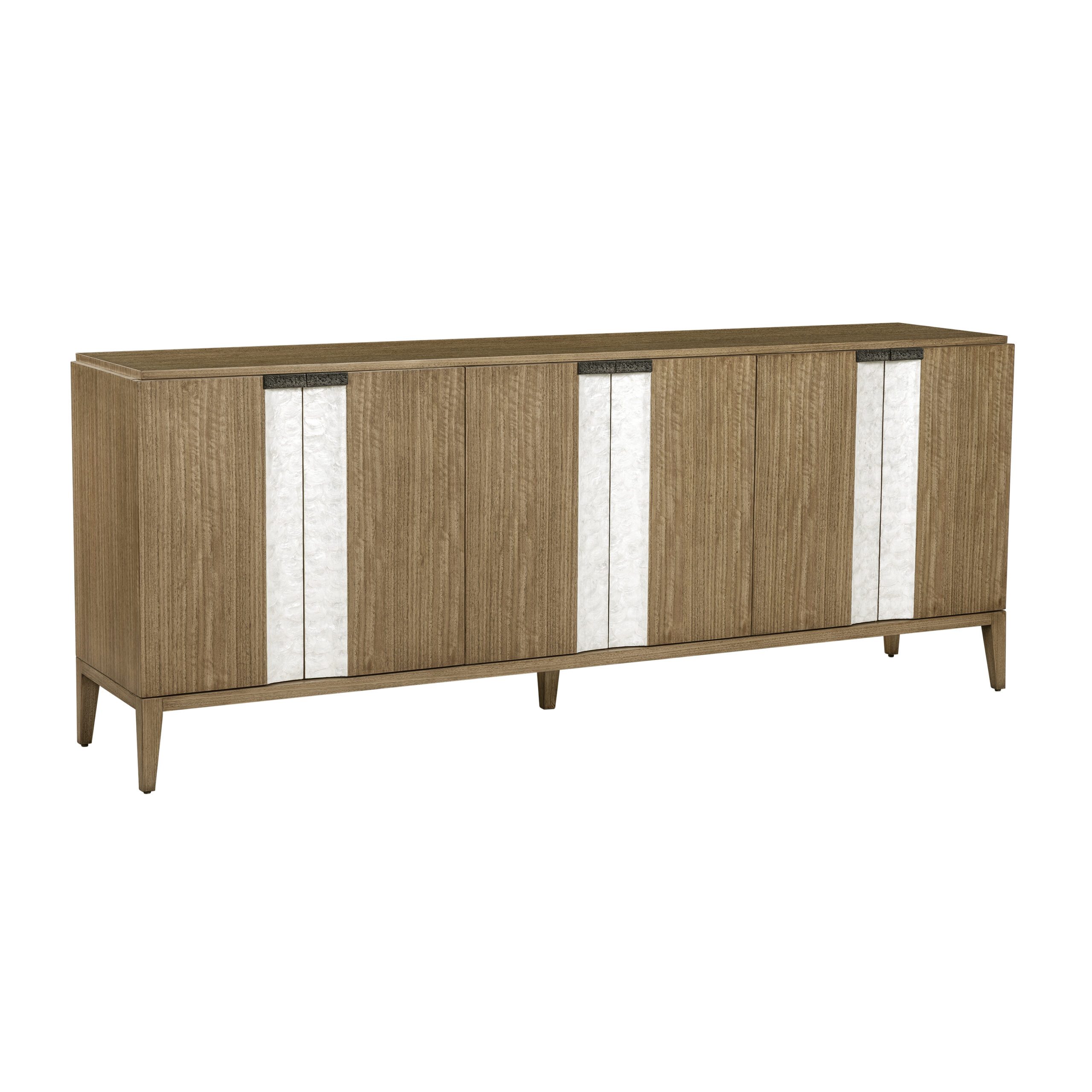 Our Aberdeen Sideboard features a smooth top, six doors with a “concave” Capiz shell detail, interior shelving, and textured bronze hardware.