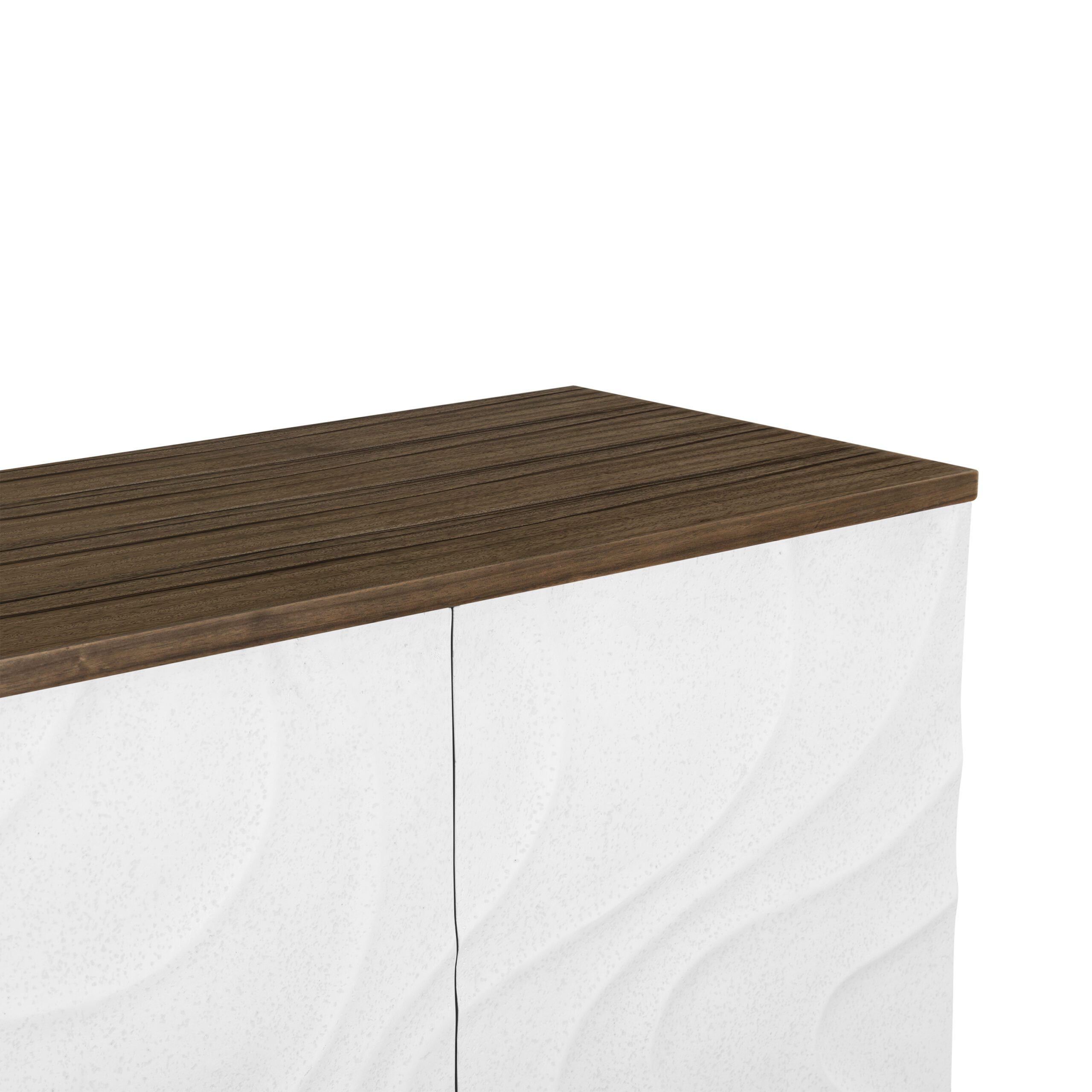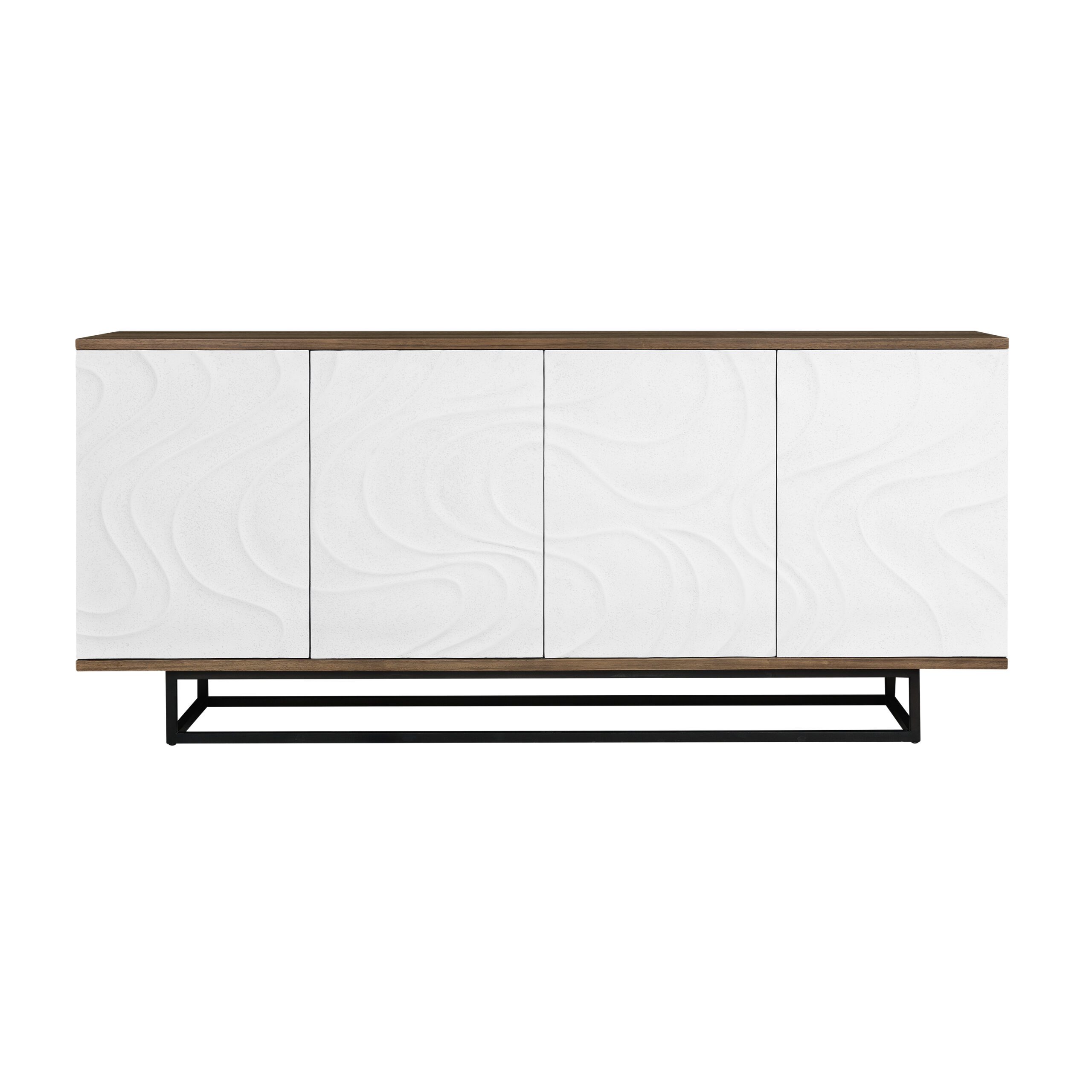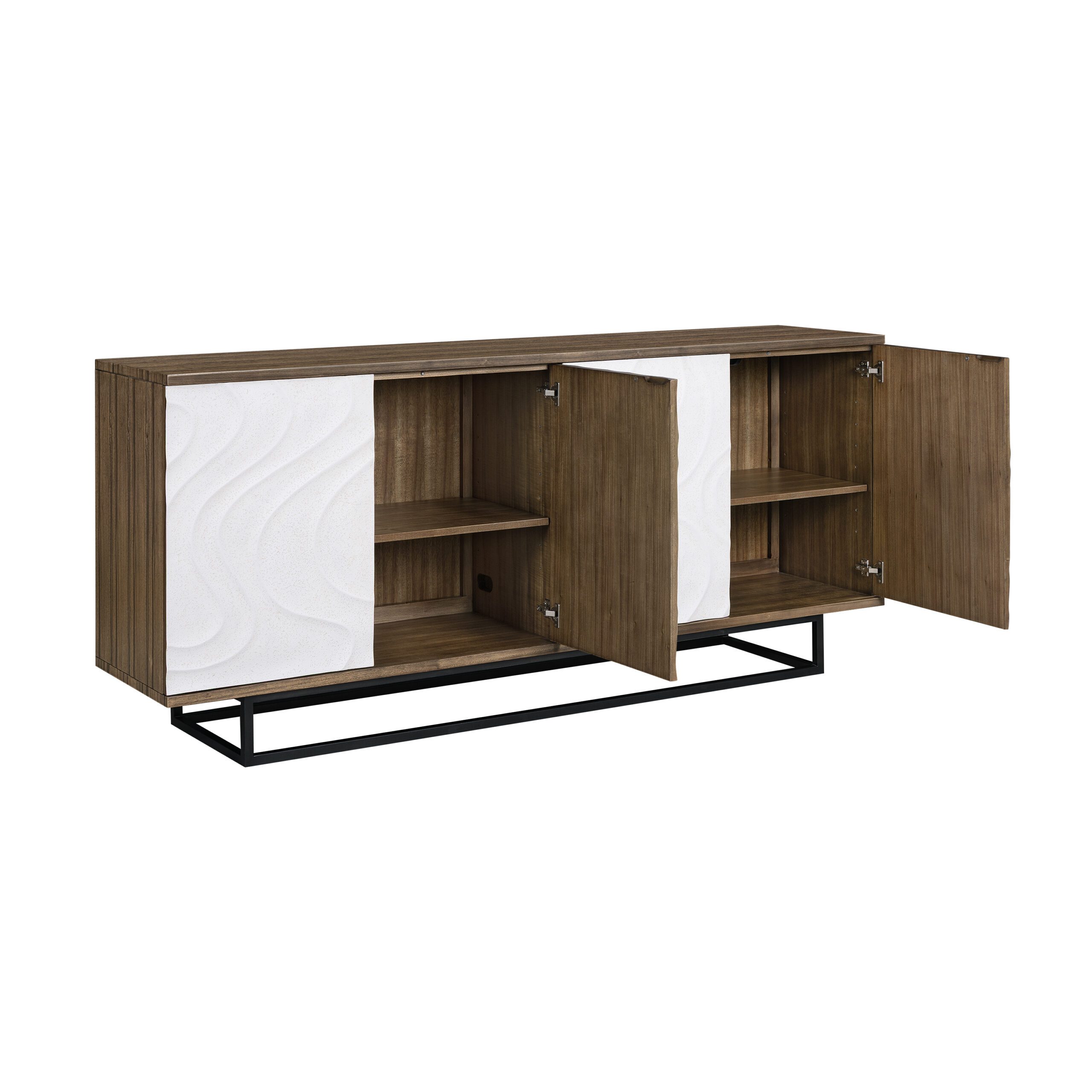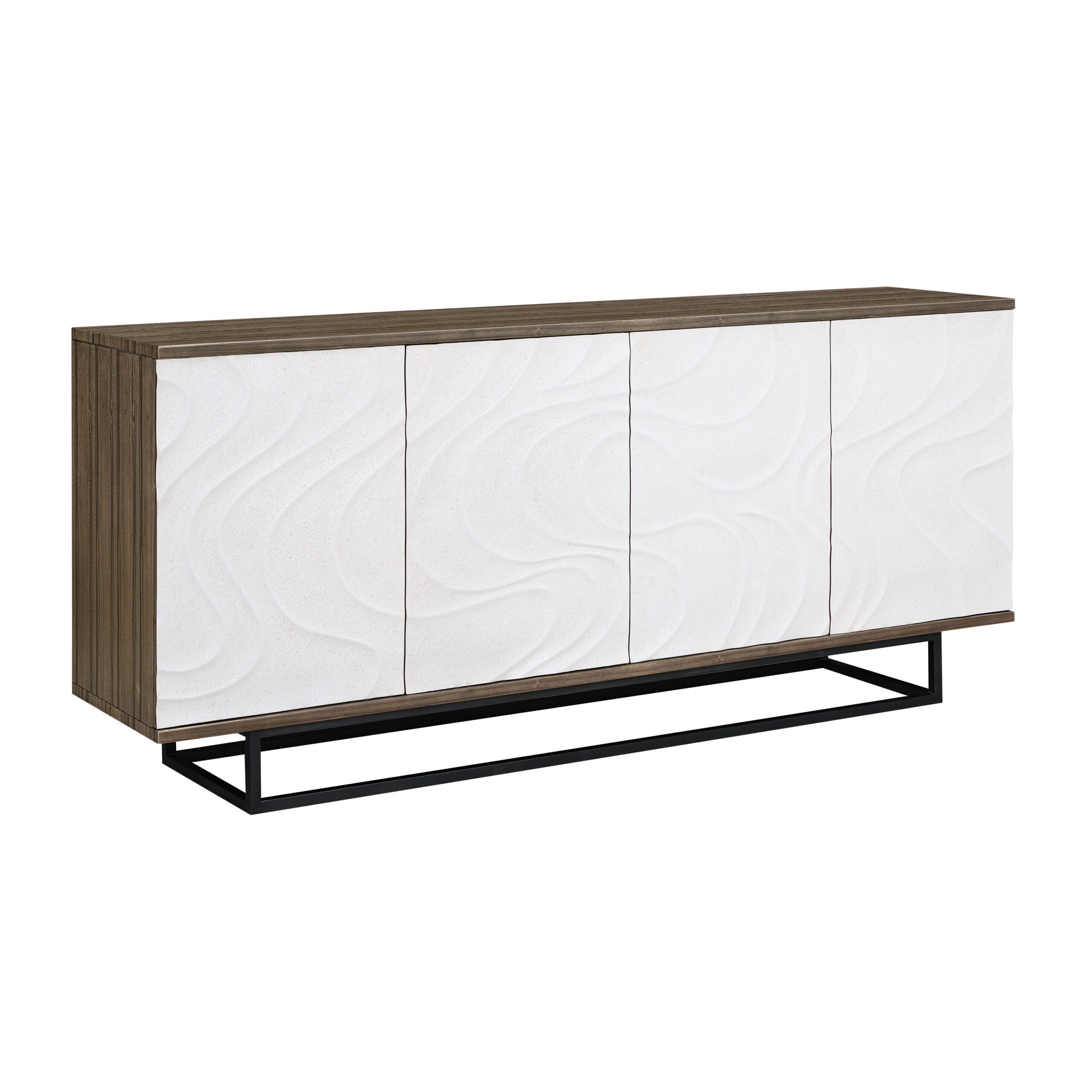 Our Dietrich Sideboard features a smooth top, four textured, “faux-concrete” door fronts, push/pull hardware, interior shelving, and a bronze base.